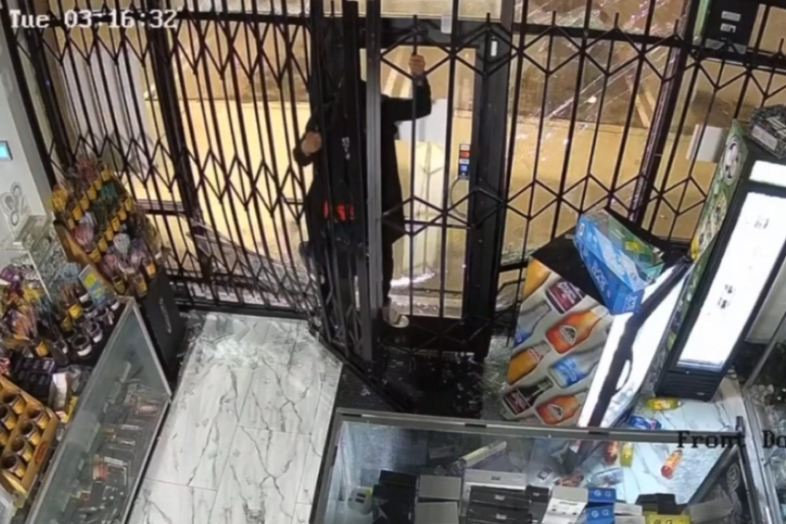 Because of the extent of the damage, the shop’s owner was unable to fully secure the business that night. Hours later, a second suspect took advantage of the compromised entrance, climbing through the broken security fence and stealing an unknown amount of merchandise from inside the store, police said.